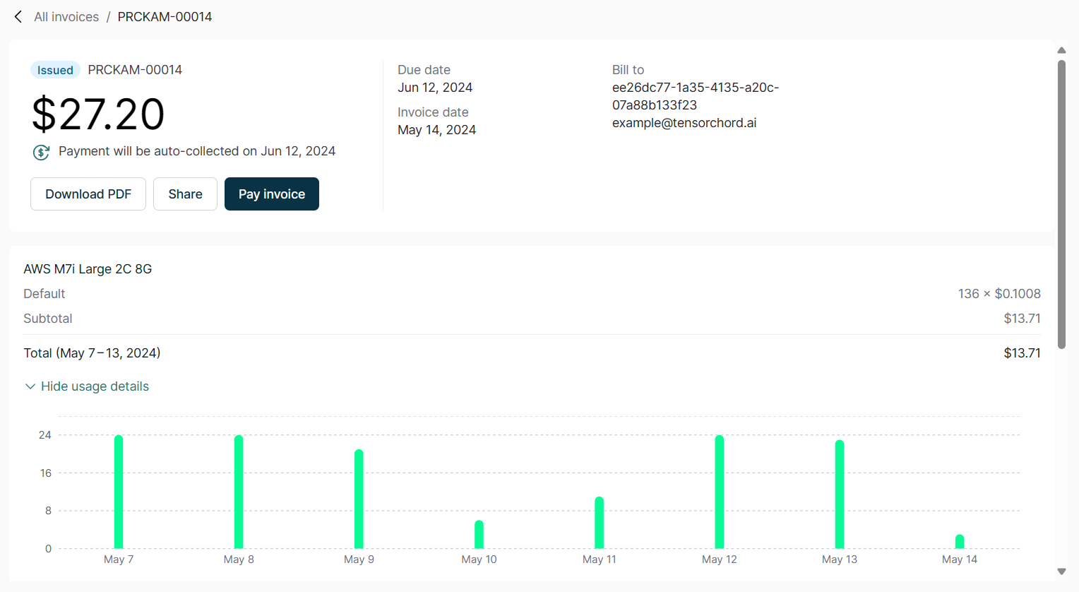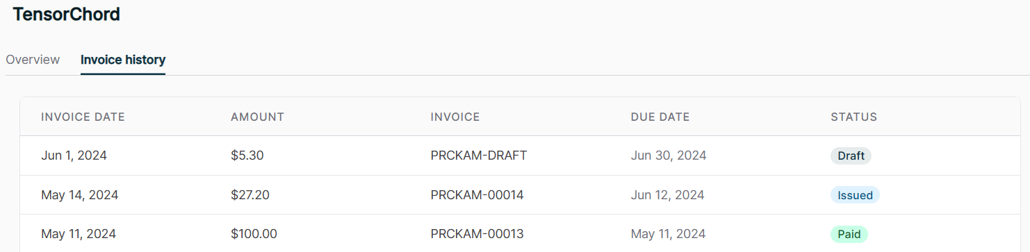 On the Invoice History page of the Customer Portal, you can view all historical invoices along with their usage over time.