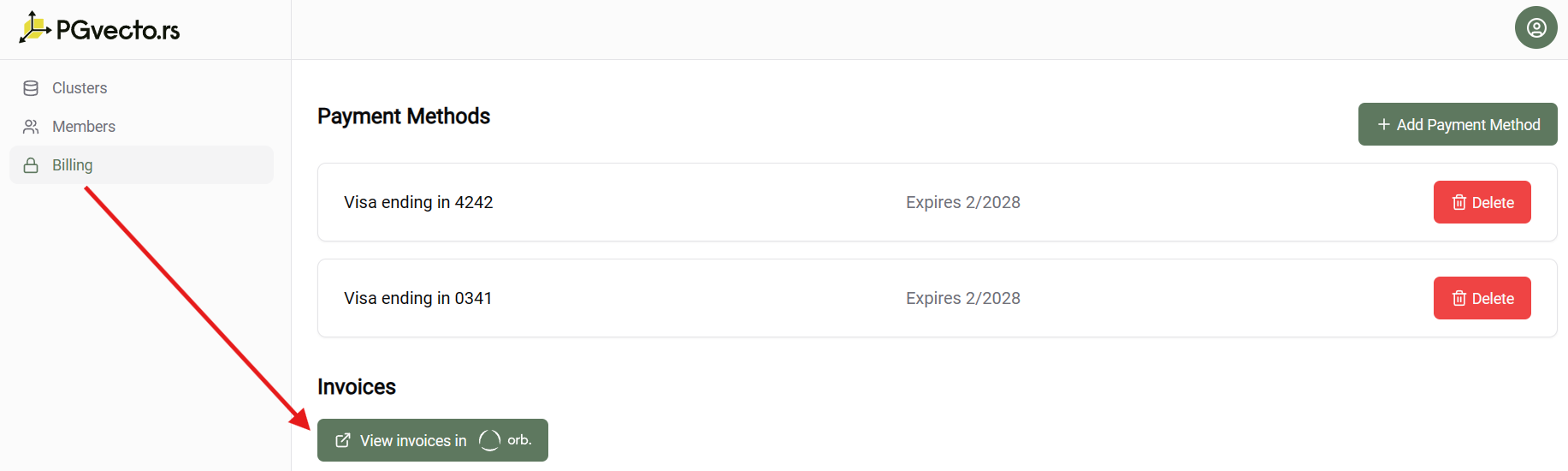 Currently, the VectorChord Cloud has Orb as its billing provider. From the Billing page, you can click View invoices in Orb to go to the Orb Customer Portal. On this external page you can do the following: