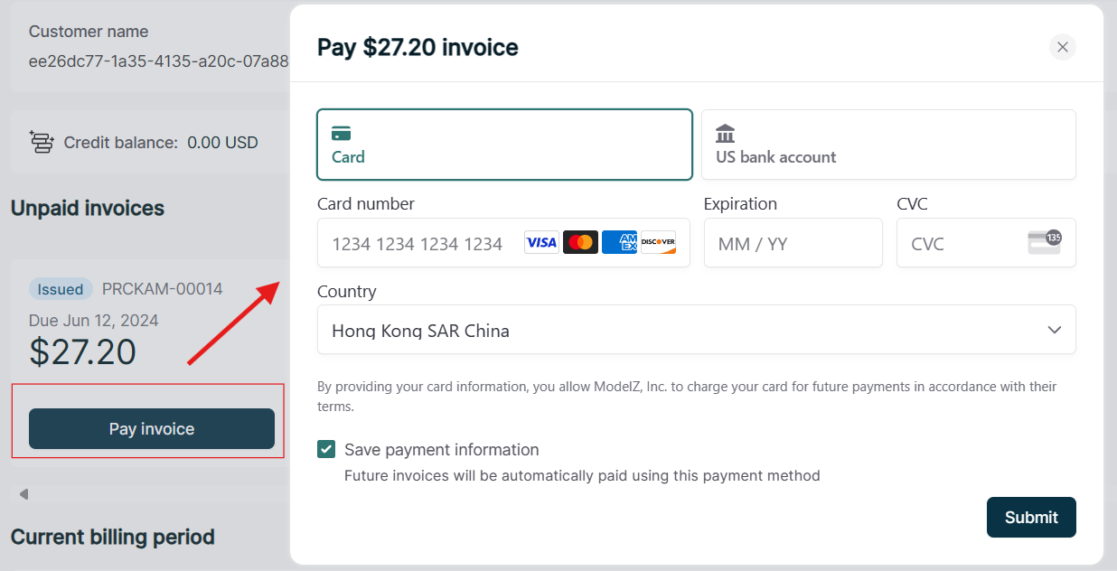 These invoices are displayed in the Unpaid Invoices section of the Overview page with a status of failed or issued, and you can pay these invoices manually.